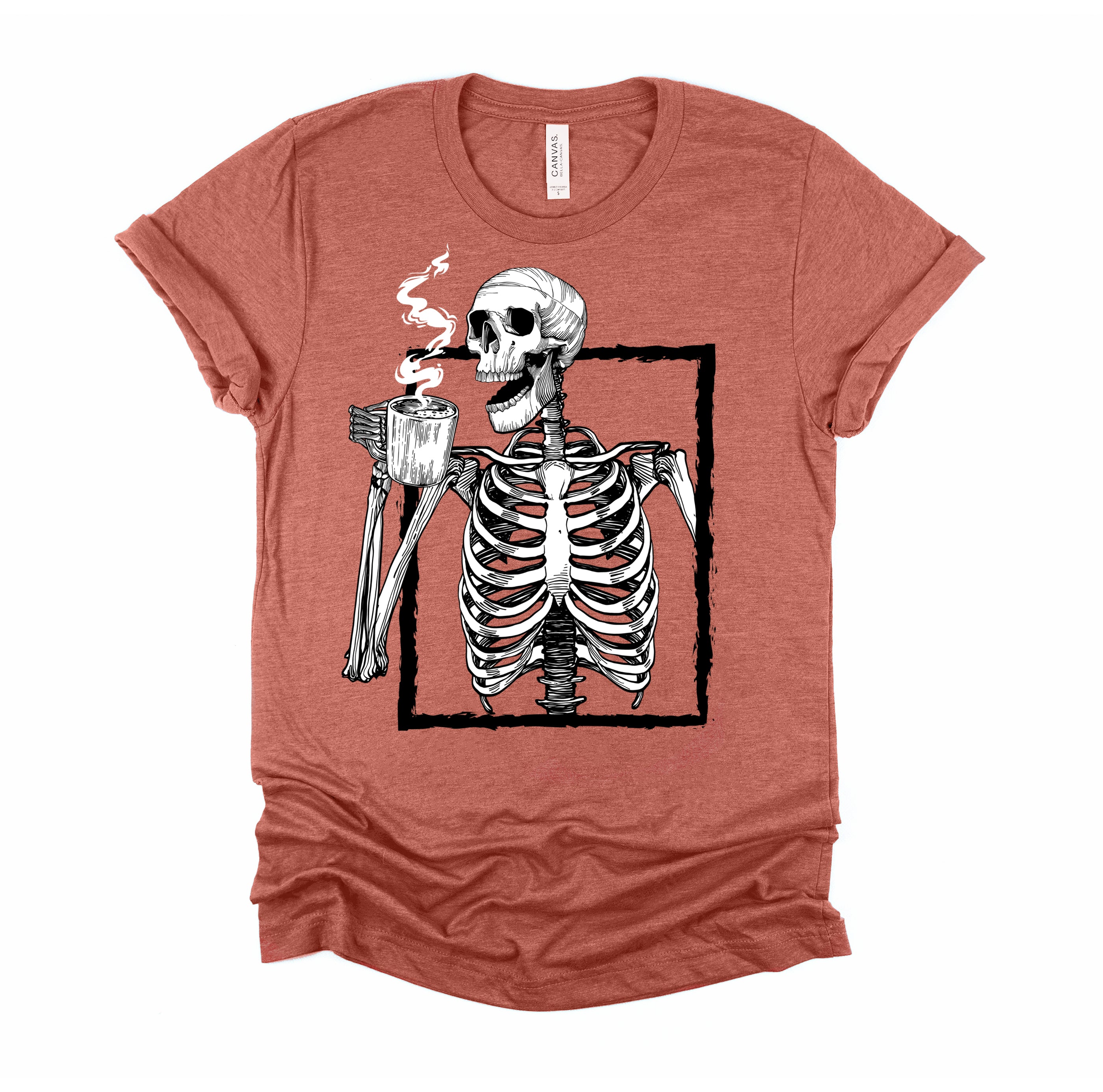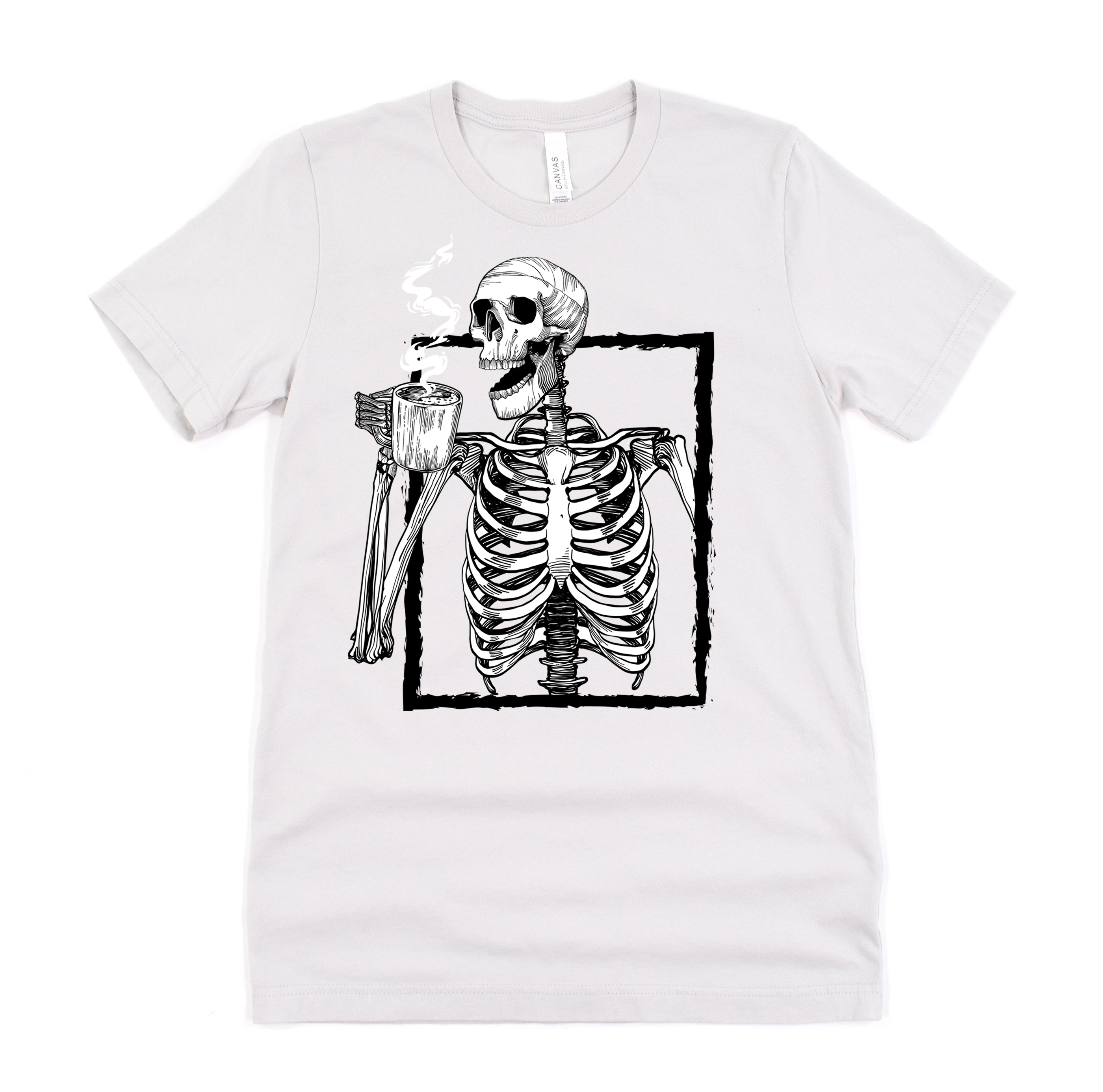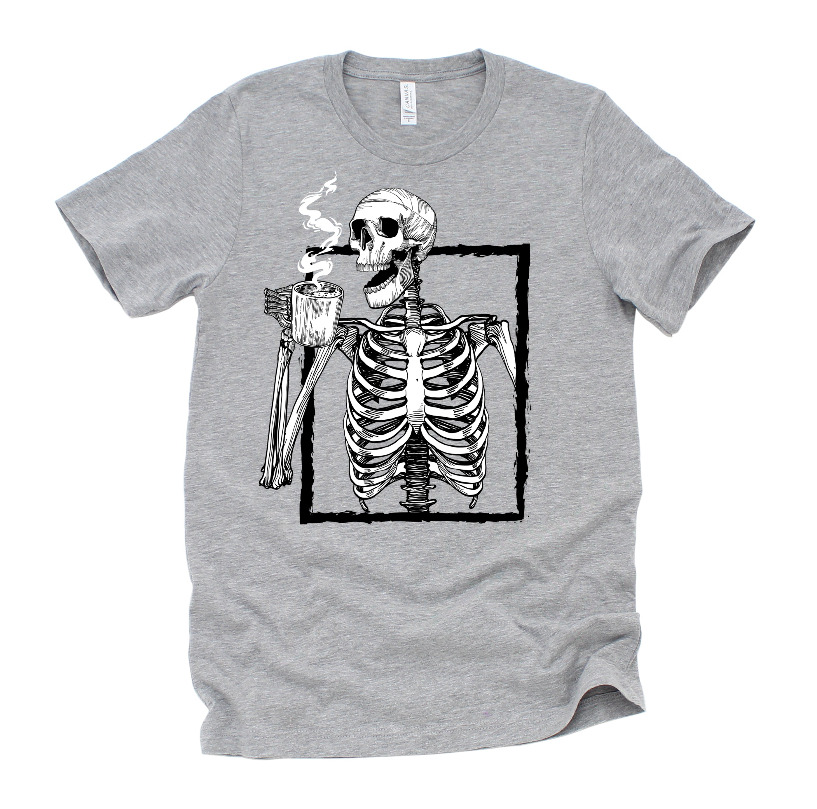 - Great way to start your stressful day is a sip of hot coffee . This funny skeleton while drinking coffee is a great design for a hardworking student, caffeine addict, boss or employee who's been very busy everyday.