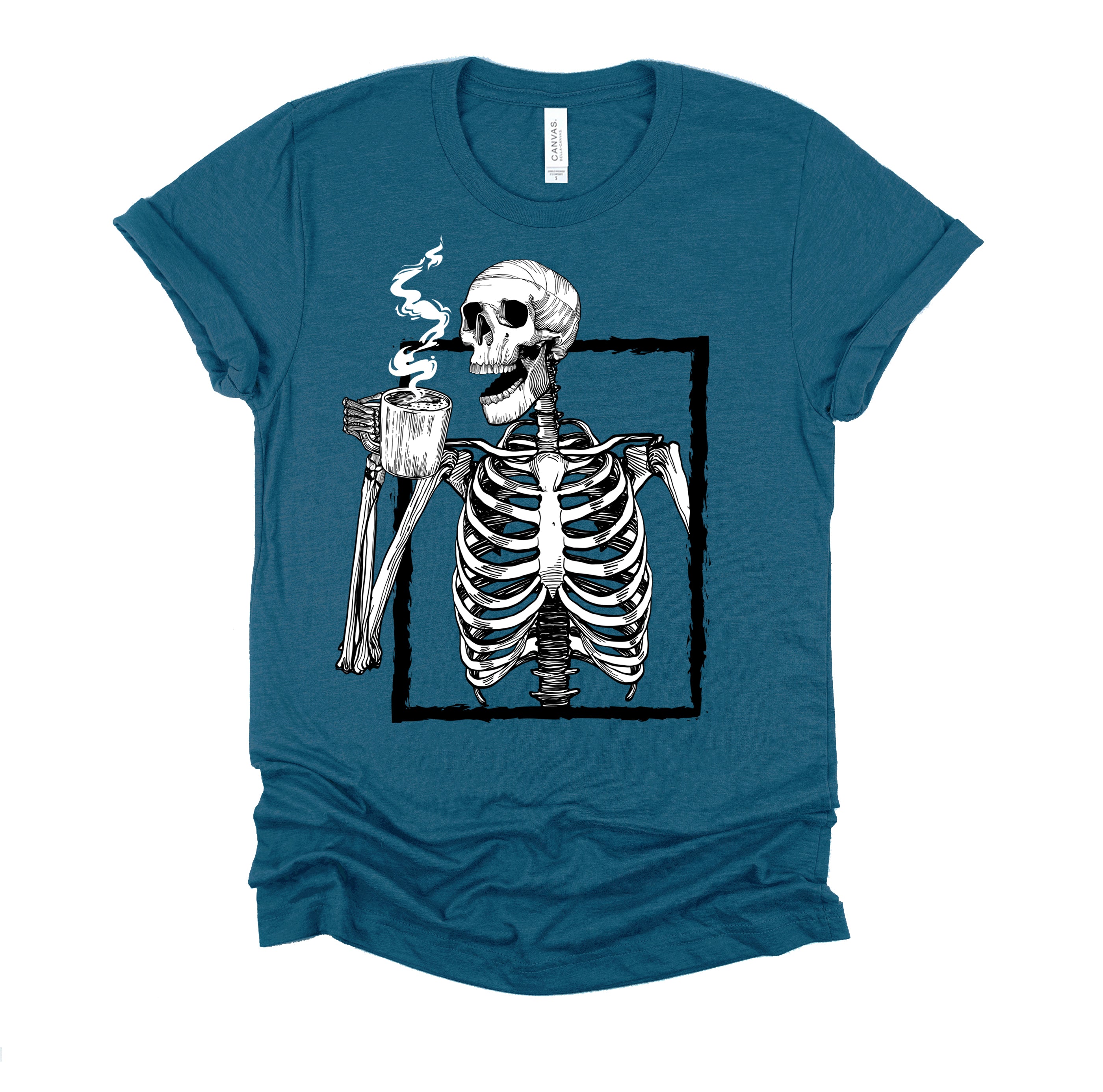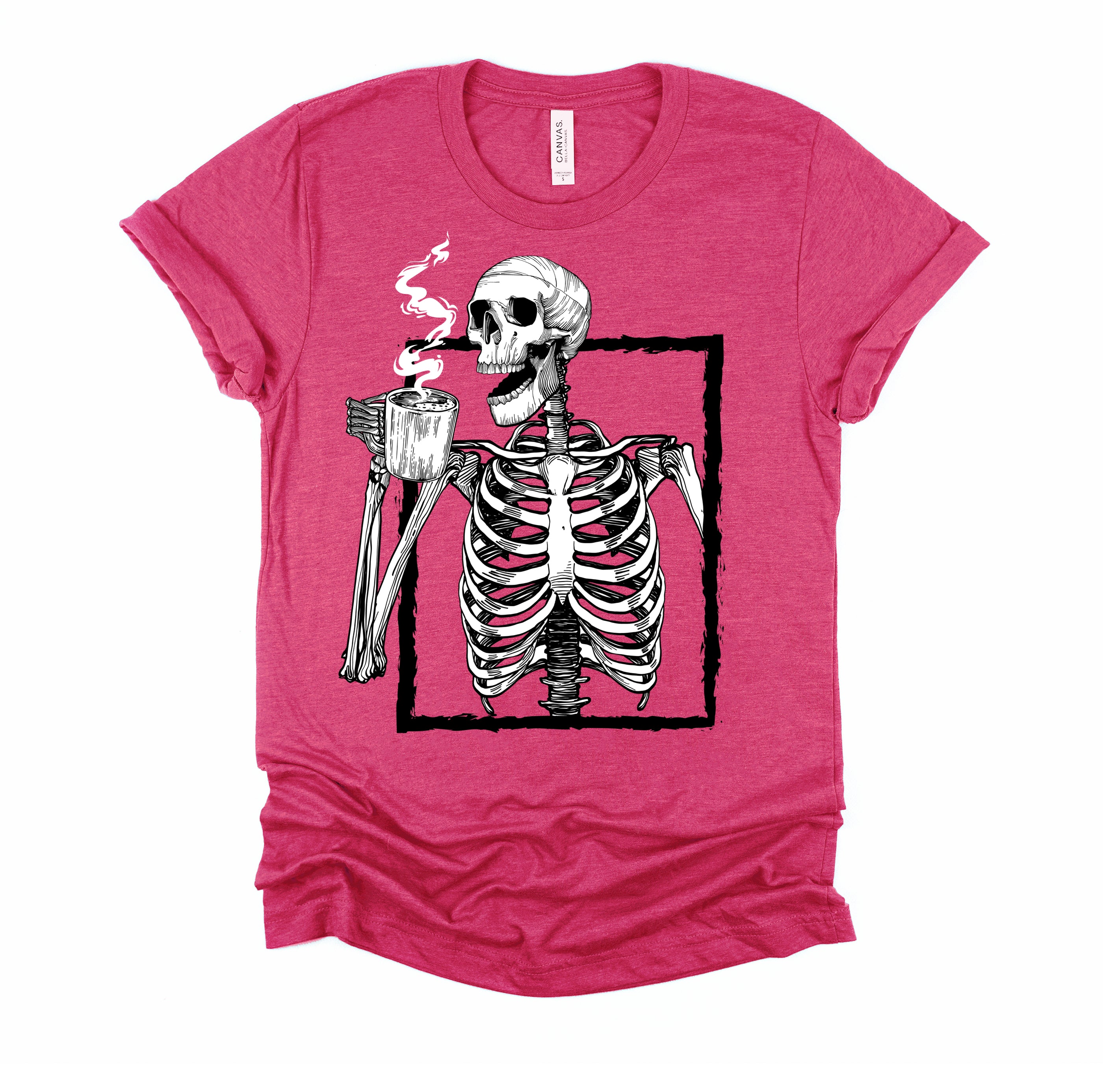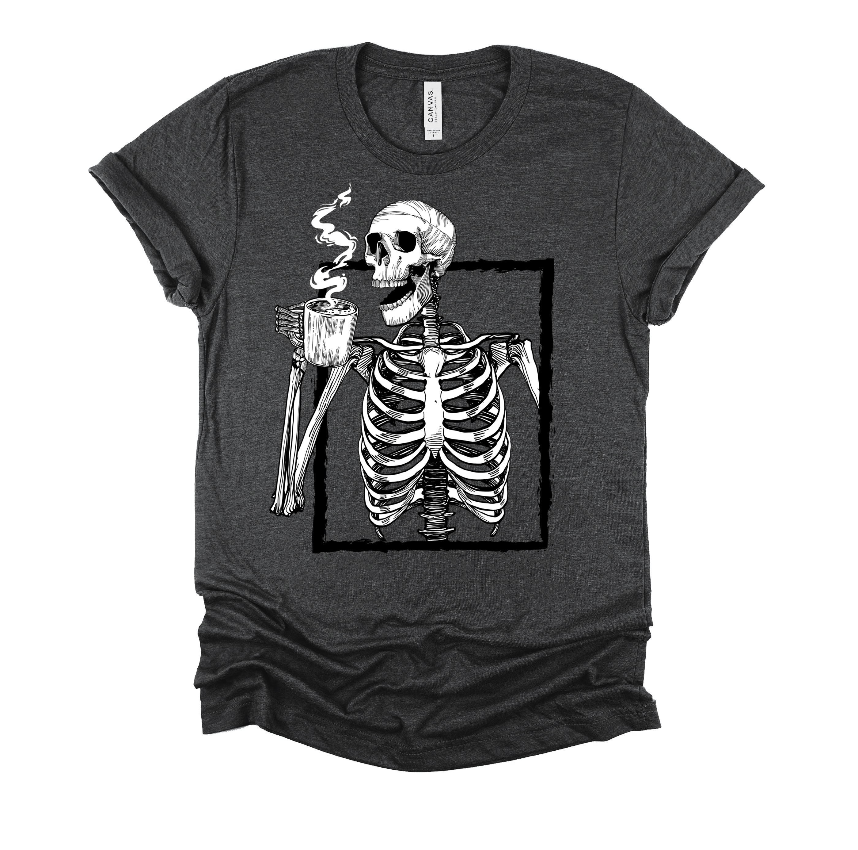 - Great way to start your stressful day is a sip of hot coffee . This funny skeleton while drinking coffee is a great design for a hardworking student, caffeine addict, boss or employee who's been very busy everyday.